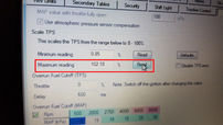 Turn the ignition key to the on position. (The engine will "NOT" be running). Connect the software to the ECU. With Hondata this is done by pressing the lightning bolt at the top left. Select TPS parameters. Next scale the minimum reading without touching the gas pedal. Take note of what voltage or percentage it's at. You want to be as close to 0.50V (closed) as possible. This will be around 0.50%. Next push the pedal all the way to the floor (WOT). Holding the pedal, click read maximum reading. You want to be as close to 100% as possible, this will be a reading of 4.50v (open). Now that you've read your TPS, click the up arrow to upload the new update to the ECU.*NOTE If the TPS %/voltage is off, you will have to loosen the TPS bolts and manually turn the TPS in either direction to get it closest to the correct voltage/% at (closed throttle). Once you are at the correct % or voltage, tight the bolts.