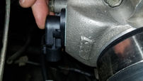 Make sure the gasket is on the TPS before installing. Take the throttle positioning sensor, line it up to be placed inside the two metal prongs inside the throttle body. Then push the TPS in and turn it towards the screw holes. This pre-loads the TPS with a little bit of tension so there's never any slack. Place the bolts back in, hand tighten, and connect the electrical connector.